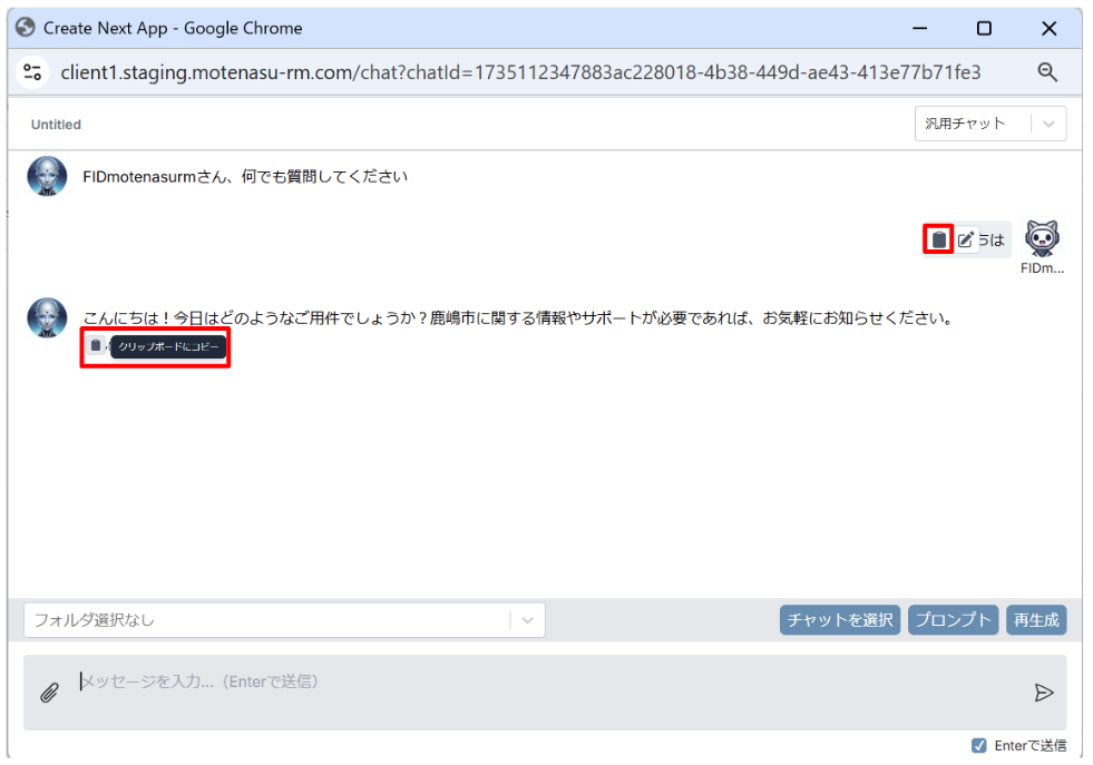 チャット画面で使える、便利な機能を用意しています。メッセージの再生成や編集、コピー機能を活用して、スムーズにチャットを進めましょう。