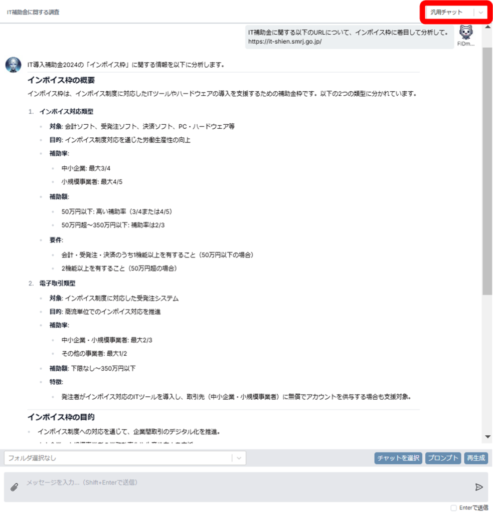 調査したいWebサイトのURLを含めてAIに質問を送ると、AIが内容を詳しく分析し、要約して提示します。