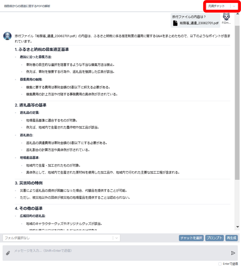 冒頭で「添付ファイルを解析して、~」のニュアンスを含めてAIに質問を送ると、AIが添付ファイルの内容を分析し、要約や考察を提示します。