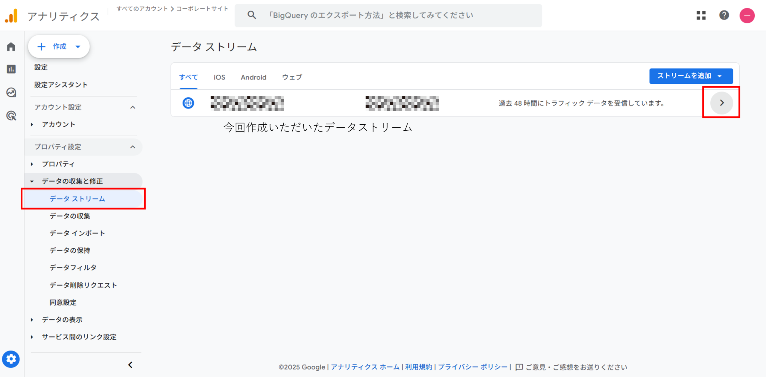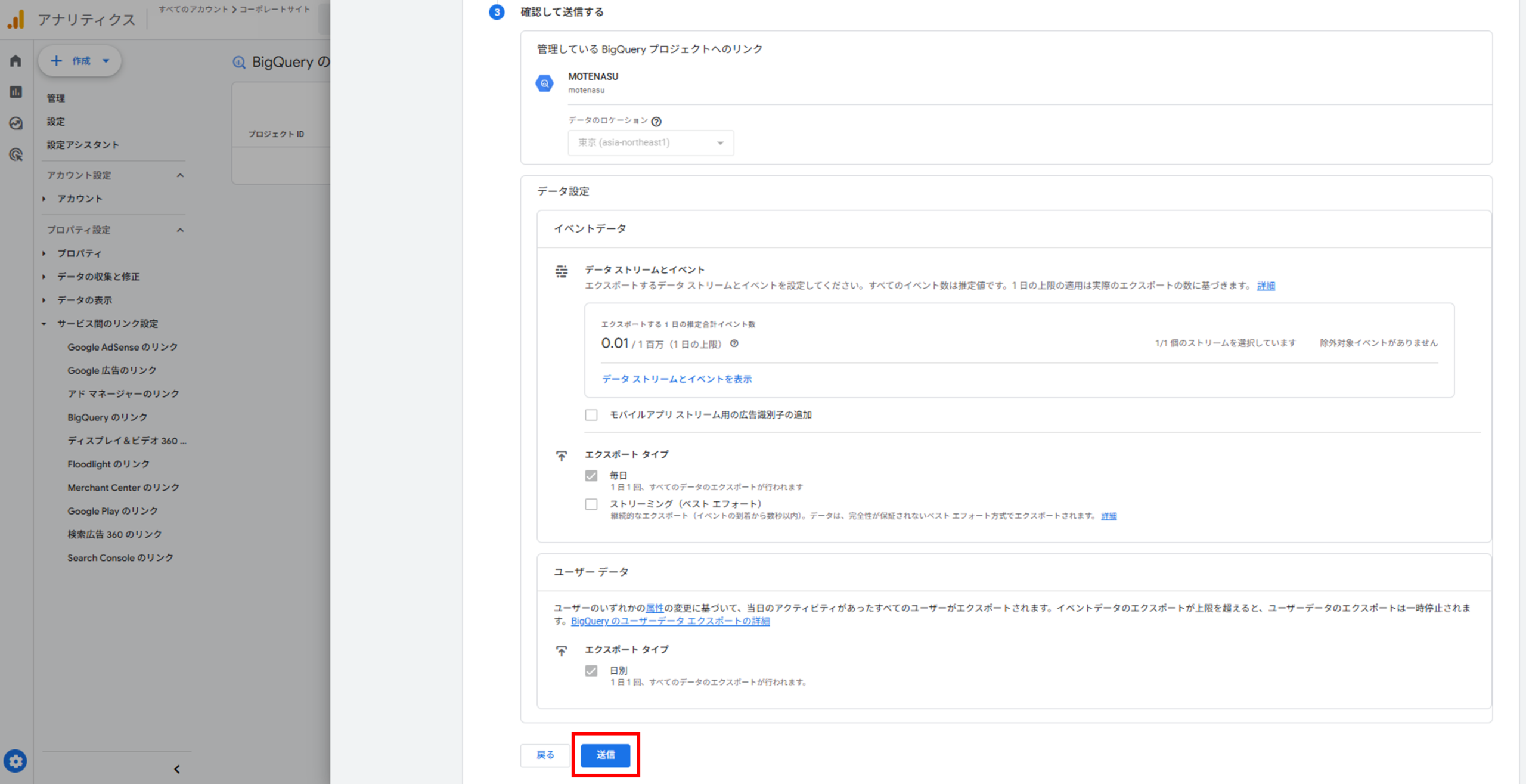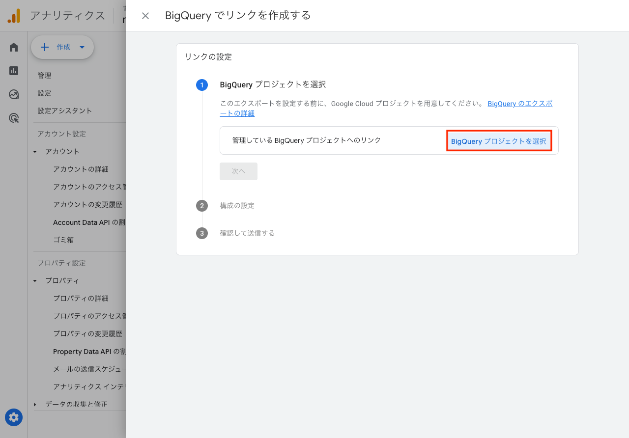 FID側でのセットアップ完了後、お客様のGA4管理画面でBigQuery連携の設定を行います。