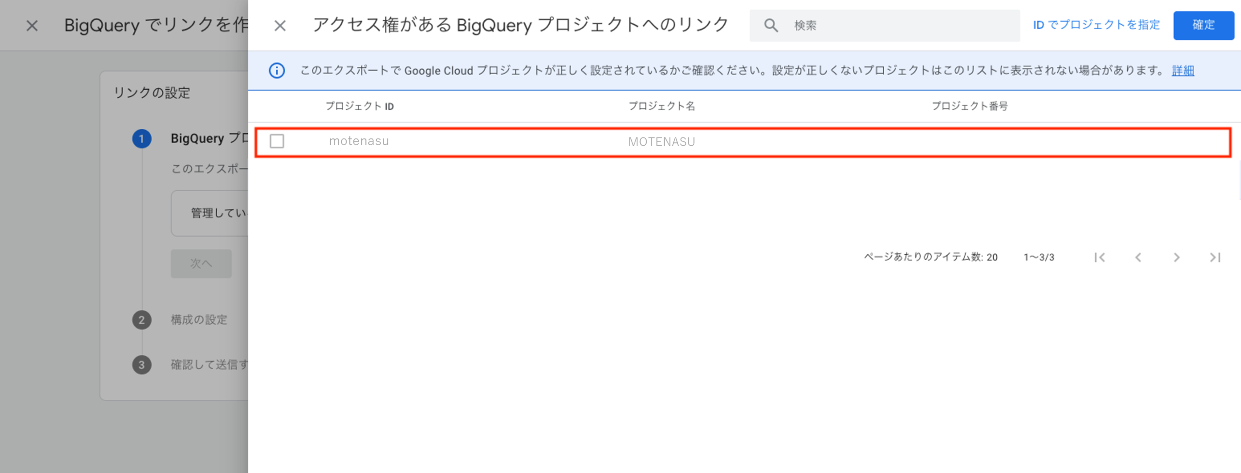 アクセス権のあるBigQueryプロジェクト一覧から「motenasu」を選択します。
